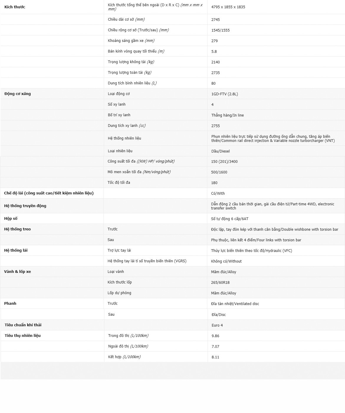 Ở phiên bản 2.8L với những tinh chỉnh trong thiết kế , giúp động cơ của FORTUNER thuộc TOP những động cơ mạnh nhất phân khúc khi công suất đạt 201 HP tại 3400 Vòng/Phút...